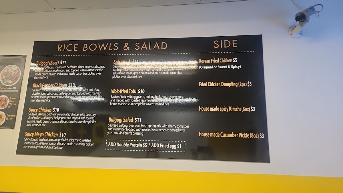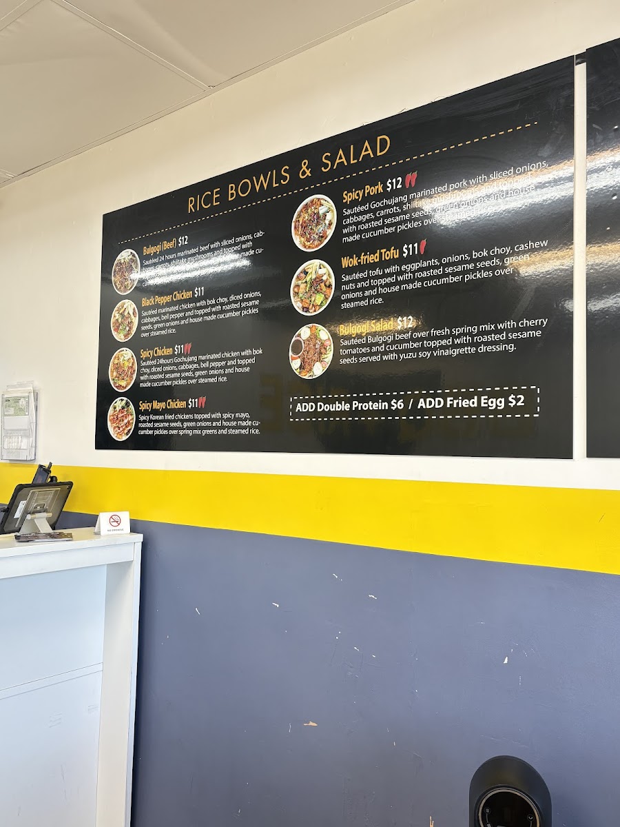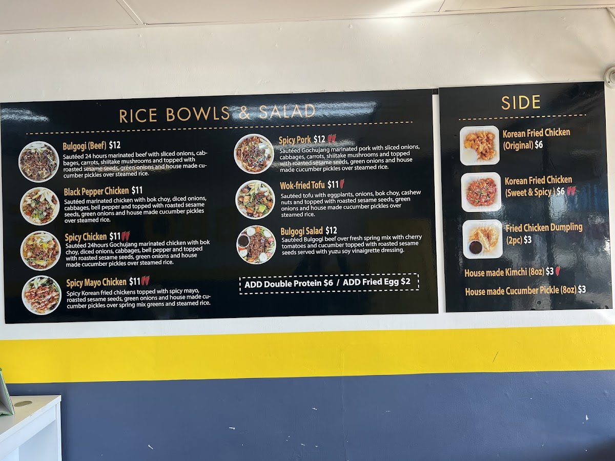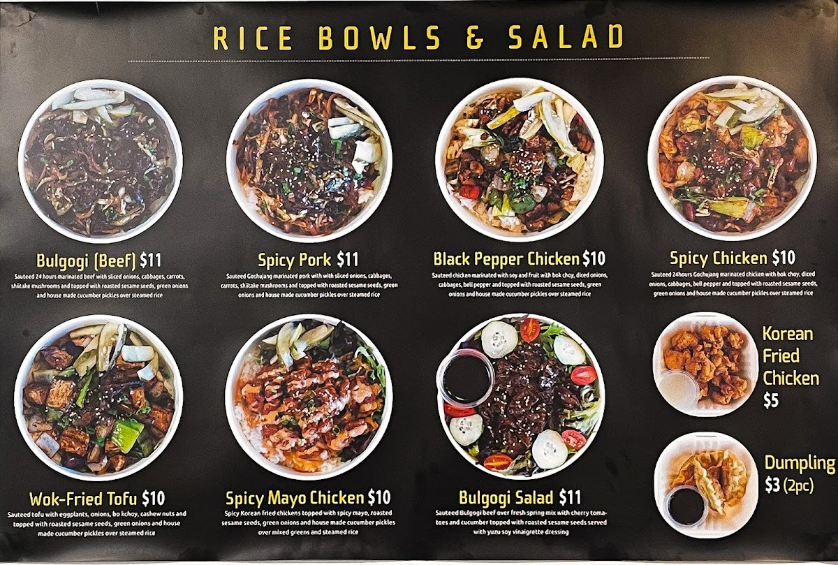 Spicy Korean fried chickens topped with spicy mayo, roasted sesame seeds, green onions and house made cucumber pickles over mixed greens and steamed rice.