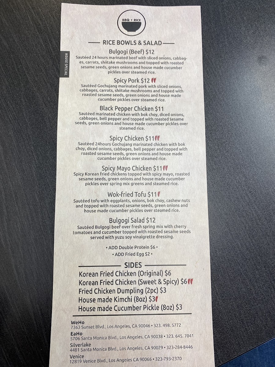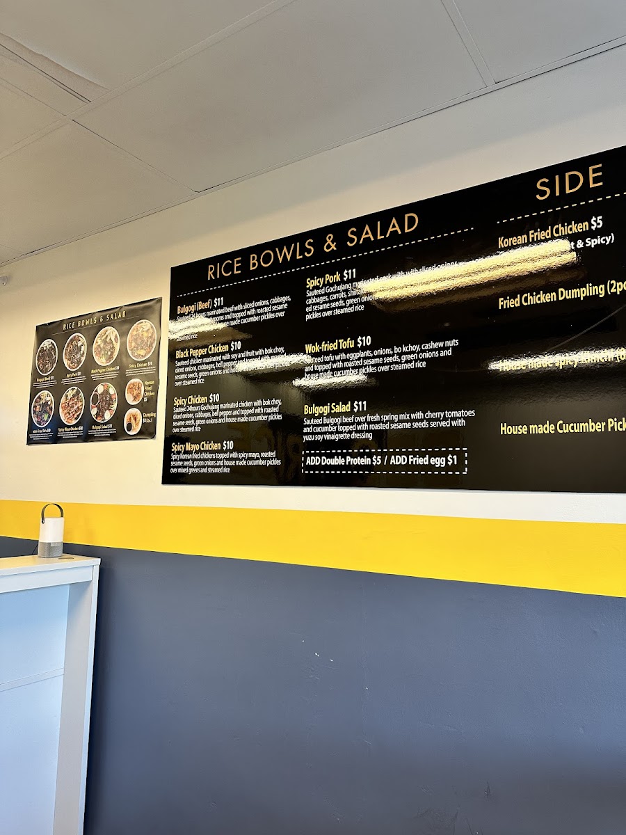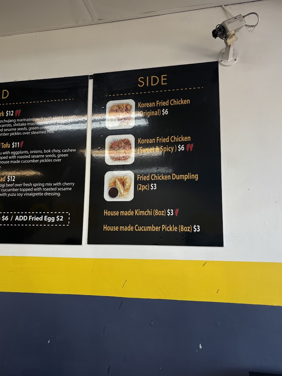 Spicy Korean fried chickens topped with spicy mayo, roasted sesame seeds, green onions and house made cucumber pickles over mixed greens and steamed rice.