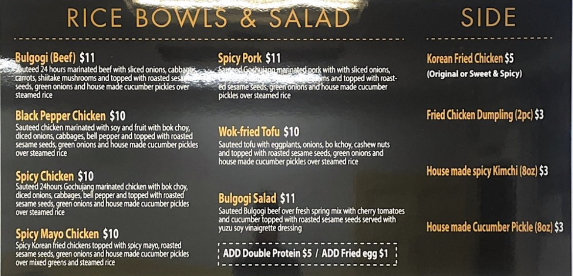 Sautéed 24hours Gochujang marinated chicken with bok choy, diced onions, cabbages, bell pepper and topped with roasted sesame seeds, green onions and house made cucumber pickles over steamed rice.